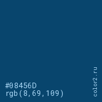 Цвет #08456D в цветовой модели RGB обозначается тремя октетами (8, 69, 109) в десятичном формате и #08456D в шестнадцатиричном (hex) формате, которые являются интенсивностью красного 8 (hex 08), интенсивность зелёного 69 (hex 45) и интенсивность синего 109 (hex 6D).
