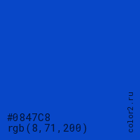Цвет #0847C8 в цветовой модели RGB обозначается тремя октетами (8, 71, 200) в десятичном формате и #0847C8 в шестнадцатиричном (hex) формате, которые являются интенсивностью красного 8 (hex 08), интенсивность зелёного 71 (hex 47) и интенсивность синего 200 (hex C8).
