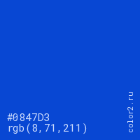 Цвет #0847D3 в цветовой модели RGB обозначается тремя октетами (8, 71, 211) в десятичном формате и #0847D3 в шестнадцатиричном (hex) формате, которые являются интенсивностью красного 8 (hex 08), интенсивность зелёного 71 (hex 47) и интенсивность синего 211 (hex D3).
