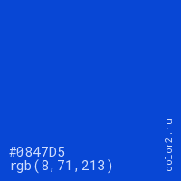 Цвет #0847D5 в цветовой модели RGB обозначается тремя октетами (8, 71, 213) в десятичном формате и #0847D5 в шестнадцатиричном (hex) формате, которые являются интенсивностью красного 8 (hex 08), интенсивность зелёного 71 (hex 47) и интенсивность синего 213 (hex D5).