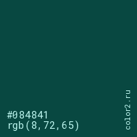 Цвет #084841 в цветовой модели RGB обозначается тремя октетами (8, 72, 65) в десятичном формате и #084841 в шестнадцатиричном (hex) формате, которые являются интенсивностью красного 8 (hex 08), интенсивность зелёного 72 (hex 48) и интенсивность синего 65 (hex 41).