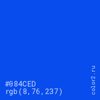 Цвет #084CED в цветовой модели RGB обозначается тремя октетами (8, 76, 237) в десятичном формате и #084CED в шестнадцатиричном (hex) формате, которые являются интенсивностью красного 8 (hex 08), интенсивность зелёного 76 (hex 4C) и интенсивность синего 237 (hex ED).