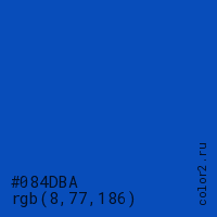 Цвет #084DBA в цветовой модели RGB обозначается тремя октетами (8, 77, 186) в десятичном формате и #084DBA в шестнадцатиричном (hex) формате, которые являются интенсивностью красного 8 (hex 08), интенсивность зелёного 77 (hex 4D) и интенсивность синего 186 (hex BA).