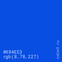 Цвет #084EE3 в цветовой модели RGB обозначается тремя октетами (8, 78, 227) в десятичном формате и #084EE3 в шестнадцатиричном (hex) формате, которые являются интенсивностью красного 8 (hex 08), интенсивность зелёного 78 (hex 4E) и интенсивность синего 227 (hex E3).