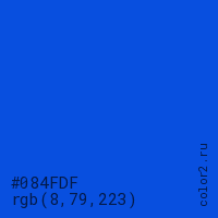 Цвет #084FDF в цветовой модели RGB обозначается тремя октетами (8, 79, 223) в десятичном формате и #084FDF в шестнадцатиричном (hex) формате, которые являются интенсивностью красного 8 (hex 08), интенсивность зелёного 79 (hex 4F) и интенсивность синего 223 (hex DF).