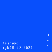 Цвет #084FFC в цветовой модели RGB обозначается тремя октетами (8, 79, 252) в десятичном формате и #084FFC в шестнадцатиричном (hex) формате, которые являются интенсивностью красного 8 (hex 08), интенсивность зелёного 79 (hex 4F) и интенсивность синего 252 (hex FC).