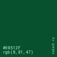 Цвет #08512F в цветовой модели RGB обозначается тремя октетами (8, 81, 47) в десятичном формате и #08512F в шестнадцатиричном (hex) формате, которые являются интенсивностью красного 8 (hex 08), интенсивность зелёного 81 (hex 51) и интенсивность синего 47 (hex 2F).
