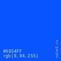Цвет #0854FF в цветовой модели RGB обозначается тремя октетами (8, 84, 255) в десятичном формате и #0854FF в шестнадцатиричном (hex) формате, которые являются интенсивностью красного 8 (hex 08), интенсивность зелёного 84 (hex 54) и интенсивность синего 255 (hex FF).