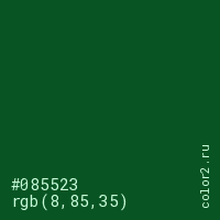 Цвет #085523 в цветовой модели RGB обозначается тремя октетами (8, 85, 35) в десятичном формате и #085523 в шестнадцатиричном (hex) формате, которые являются интенсивностью красного 8 (hex 08), интенсивность зелёного 85 (hex 55) и интенсивность синего 35 (hex 23).