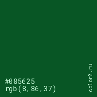 Цвет #085625 в цветовой модели RGB обозначается тремя октетами (8, 86, 37) в десятичном формате и #085625 в шестнадцатиричном (hex) формате, которые являются интенсивностью красного 8 (hex 08), интенсивность зелёного 86 (hex 56) и интенсивность синего 37 (hex 25).