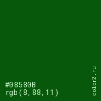 Цвет #08580B в цветовой модели RGB обозначается тремя октетами (8, 88, 11) в десятичном формате и #08580B в шестнадцатиричном (hex) формате, которые являются интенсивностью красного 8 (hex 08), интенсивность зелёного 88 (hex 58) и интенсивность синего 11 (hex 0B).