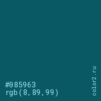 Цвет #085963 в цветовой модели RGB обозначается тремя октетами (8, 89, 99) в десятичном формате и #085963 в шестнадцатиричном (hex) формате, которые являются интенсивностью красного 8 (hex 08), интенсивность зелёного 89 (hex 59) и интенсивность синего 99 (hex 63).