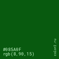 Цвет #085A0F в цветовой модели RGB обозначается тремя октетами (8, 90, 15) в десятичном формате и #085A0F в шестнадцатиричном (hex) формате, которые являются интенсивностью красного 8 (hex 08), интенсивность зелёного 90 (hex 5A) и интенсивность синего 15 (hex 0F).