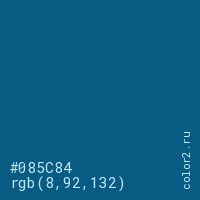 Цвет #085C84 в цветовой модели RGB обозначается тремя октетами (8, 92, 132) в десятичном формате и #085C84 в шестнадцатиричном (hex) формате, которые являются интенсивностью красного 8 (hex 08), интенсивность зелёного 92 (hex 5C) и интенсивность синего 132 (hex 84).