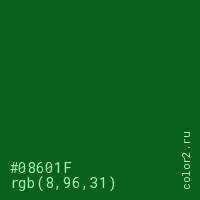 Цвет #08601F в цветовой модели RGB обозначается тремя октетами (8, 96, 31) в десятичном формате и #08601F в шестнадцатиричном (hex) формате, которые являются интенсивностью красного 8 (hex 08), интенсивность зелёного 96 (hex 60) и интенсивность синего 31 (hex 1F).