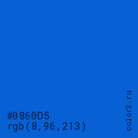 Цвет #0860D5 в цветовой модели RGB обозначается тремя октетами (8, 96, 213) в десятичном формате и #0860D5 в шестнадцатиричном (hex) формате, которые являются интенсивностью красного 8 (hex 08), интенсивность зелёного 96 (hex 60) и интенсивность синего 213 (hex D5).