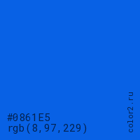 Цвет #0861E5 в цветовой модели RGB обозначается тремя октетами (8, 97, 229) в десятичном формате и #0861E5 в шестнадцатиричном (hex) формате, которые являются интенсивностью красного 8 (hex 08), интенсивность зелёного 97 (hex 61) и интенсивность синего 229 (hex E5).