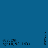 Цвет #08628F в цветовой модели RGB обозначается тремя октетами (8, 98, 143) в десятичном формате и #08628F в шестнадцатиричном (hex) формате, которые являются интенсивностью красного 8 (hex 08), интенсивность зелёного 98 (hex 62) и интенсивность синего 143 (hex 8F).