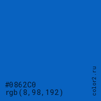 Цвет #0862C0 в цветовой модели RGB обозначается тремя октетами (8, 98, 192) в десятичном формате и #0862C0 в шестнадцатиричном (hex) формате, которые являются интенсивностью красного 8 (hex 08), интенсивность зелёного 98 (hex 62) и интенсивность синего 192 (hex C0).
