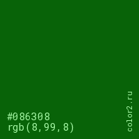 Цвет #086308 в цветовой модели RGB обозначается тремя октетами (8, 99, 8) в десятичном формате и #086308 в шестнадцатиричном (hex) формате, которые являются интенсивностью красного 8 (hex 08), интенсивность зелёного 99 (hex 63) и интенсивность синего 8 (hex 08).