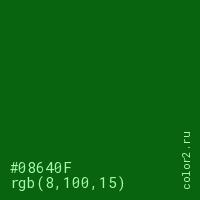 Цвет #08640F в цветовой модели RGB обозначается тремя октетами (8, 100, 15) в десятичном формате и #08640F в шестнадцатиричном (hex) формате, которые являются интенсивностью красного 8 (hex 08), интенсивность зелёного 100 (hex 64) и интенсивность синего 15 (hex 0F).
