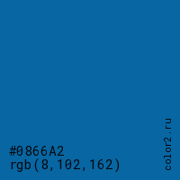 Цвет #0866A2 в цветовой модели RGB обозначается тремя октетами (8, 102, 162) в десятичном формате и #0866A2 в шестнадцатиричном (hex) формате, которые являются интенсивностью красного 8 (hex 08), интенсивность зелёного 102 (hex 66) и интенсивность синего 162 (hex A2).