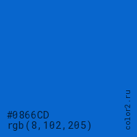 Цвет #0866CD в цветовой модели RGB обозначается тремя октетами (8, 102, 205) в десятичном формате и #0866CD в шестнадцатиричном (hex) формате, которые являются интенсивностью красного 8 (hex 08), интенсивность зелёного 102 (hex 66) и интенсивность синего 205 (hex CD).
