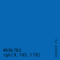 Цвет #0867B2 в цветовой модели RGB обозначается тремя октетами (8, 103, 178) в десятичном формате и #0867B2 в шестнадцатиричном (hex) формате, которые являются интенсивностью красного 8 (hex 08), интенсивность зелёного 103 (hex 67) и интенсивность синего 178 (hex B2).