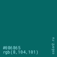 Цвет #086865 в цветовой модели RGB обозначается тремя октетами (8, 104, 101) в десятичном формате и #086865 в шестнадцатиричном (hex) формате, которые являются интенсивностью красного 8 (hex 08), интенсивность зелёного 104 (hex 68) и интенсивность синего 101 (hex 65).