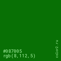 Цвет #087005 в цветовой модели RGB обозначается тремя октетами (8, 112, 5) в десятичном формате и #087005 в шестнадцатиричном (hex) формате, которые являются интенсивностью красного 8 (hex 08), интенсивность зелёного 112 (hex 70) и интенсивность синего 5 (hex 05).