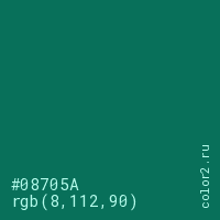 Цвет #08705A в цветовой модели RGB обозначается тремя октетами (8, 112, 90) в десятичном формате и #08705A в шестнадцатиричном (hex) формате, которые являются интенсивностью красного 8 (hex 08), интенсивность зелёного 112 (hex 70) и интенсивность синего 90 (hex 5A).