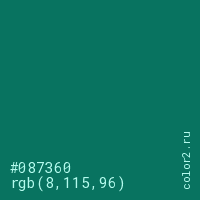 Цвет #087360 в цветовой модели RGB обозначается тремя октетами (8, 115, 96) в десятичном формате и #087360 в шестнадцатиричном (hex) формате, которые являются интенсивностью красного 8 (hex 08), интенсивность зелёного 115 (hex 73) и интенсивность синего 96 (hex 60).