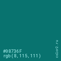 Цвет #08736F в цветовой модели RGB обозначается тремя октетами (8, 115, 111) в десятичном формате и #08736F в шестнадцатиричном (hex) формате, которые являются интенсивностью красного 8 (hex 08), интенсивность зелёного 115 (hex 73) и интенсивность синего 111 (hex 6F).
