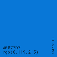 Цвет #0877D7 в цветовой модели RGB обозначается тремя октетами (8, 119, 215) в десятичном формате и #0877D7 в шестнадцатиричном (hex) формате, которые являются интенсивностью красного 8 (hex 08), интенсивность зелёного 119 (hex 77) и интенсивность синего 215 (hex D7).