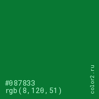 Цвет #087833 в цветовой модели RGB обозначается тремя октетами (8, 120, 51) в десятичном формате и #087833 в шестнадцатиричном (hex) формате, которые являются интенсивностью красного 8 (hex 08), интенсивность зелёного 120 (hex 78) и интенсивность синего 51 (hex 33).