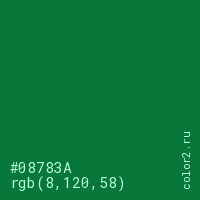 Цвет #08783A в цветовой модели RGB обозначается тремя октетами (8, 120, 58) в десятичном формате и #08783A в шестнадцатиричном (hex) формате, которые являются интенсивностью красного 8 (hex 08), интенсивность зелёного 120 (hex 78) и интенсивность синего 58 (hex 3A).