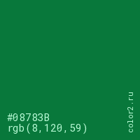 Цвет #08783B в цветовой модели RGB обозначается тремя октетами (8, 120, 59) в десятичном формате и #08783B в шестнадцатиричном (hex) формате, которые являются интенсивностью красного 8 (hex 08), интенсивность зелёного 120 (hex 78) и интенсивность синего 59 (hex 3B).