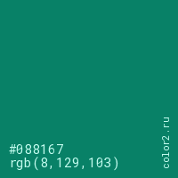 Цвет #088167 в цветовой модели RGB обозначается тремя октетами (8, 129, 103) в десятичном формате и #088167 в шестнадцатиричном (hex) формате, которые являются интенсивностью красного 8 (hex 08), интенсивность зелёного 129 (hex 81) и интенсивность синего 103 (hex 67).