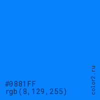 Цвет #0881FF в цветовой модели RGB обозначается тремя октетами (8, 129, 255) в десятичном формате и #0881FF в шестнадцатиричном (hex) формате, которые являются интенсивностью красного 8 (hex 08), интенсивность зелёного 129 (hex 81) и интенсивность синего 255 (hex FF).
