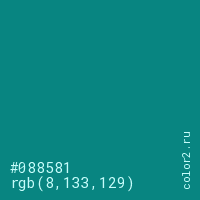 Цвет #088581 в цветовой модели RGB обозначается тремя октетами (8, 133, 129) в десятичном формате и #088581 в шестнадцатиричном (hex) формате, которые являются интенсивностью красного 8 (hex 08), интенсивность зелёного 133 (hex 85) и интенсивность синего 129 (hex 81).