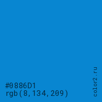 Цвет #0886D1 в цветовой модели RGB обозначается тремя октетами (8, 134, 209) в десятичном формате и #0886D1 в шестнадцатиричном (hex) формате, которые являются интенсивностью красного 8 (hex 08), интенсивность зелёного 134 (hex 86) и интенсивность синего 209 (hex D1).