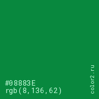 Цвет #08883E в цветовой модели RGB обозначается тремя октетами (8, 136, 62) в десятичном формате и #08883E в шестнадцатиричном (hex) формате, которые являются интенсивностью красного 8 (hex 08), интенсивность зелёного 136 (hex 88) и интенсивность синего 62 (hex 3E).