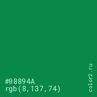 Цвет #08894A в цветовой модели RGB обозначается тремя октетами (8, 137, 74) в десятичном формате и #08894A в шестнадцатиричном (hex) формате, которые являются интенсивностью красного 8 (hex 08), интенсивность зелёного 137 (hex 89) и интенсивность синего 74 (hex 4A).