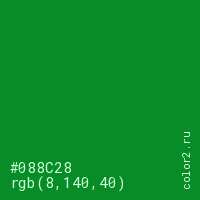 Цвет #088C28 в цветовой модели RGB обозначается тремя октетами (8, 140, 40) в десятичном формате и #088C28 в шестнадцатиричном (hex) формате, которые являются интенсивностью красного 8 (hex 08), интенсивность зелёного 140 (hex 8C) и интенсивность синего 40 (hex 28).