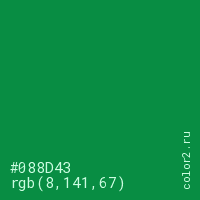 Цвет #088D43 в цветовой модели RGB обозначается тремя октетами (8, 141, 67) в десятичном формате и #088D43 в шестнадцатиричном (hex) формате, которые являются интенсивностью красного 8 (hex 08), интенсивность зелёного 141 (hex 8D) и интенсивность синего 67 (hex 43).