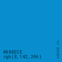 Цвет #088ECE в цветовой модели RGB обозначается тремя октетами (8, 142, 206) в десятичном формате и #088ECE в шестнадцатиричном (hex) формате, которые являются интенсивностью красного 8 (hex 08), интенсивность зелёного 142 (hex 8E) и интенсивность синего 206 (hex CE).