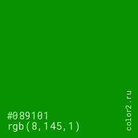 Цвет #089101 в цветовой модели RGB обозначается тремя октетами (8, 145, 1) в десятичном формате и #089101 в шестнадцатиричном (hex) формате, которые являются интенсивностью красного 8 (hex 08), интенсивность зелёного 145 (hex 91) и интенсивность синего 1 (hex 01).