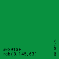 Цвет #08913F в цветовой модели RGB обозначается тремя октетами (8, 145, 63) в десятичном формате и #08913F в шестнадцатиричном (hex) формате, которые являются интенсивностью красного 8 (hex 08), интенсивность зелёного 145 (hex 91) и интенсивность синего 63 (hex 3F).