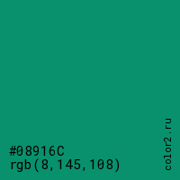 Цвет #08916C в цветовой модели RGB обозначается тремя октетами (8, 145, 108) в десятичном формате и #08916C в шестнадцатиричном (hex) формате, которые являются интенсивностью красного 8 (hex 08), интенсивность зелёного 145 (hex 91) и интенсивность синего 108 (hex 6C).