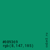 Цвет #089369 в цветовой модели RGB обозначается тремя октетами (8, 147, 105) в десятичном формате и #089369 в шестнадцатиричном (hex) формате, которые являются интенсивностью красного 8 (hex 08), интенсивность зелёного 147 (hex 93) и интенсивность синего 105 (hex 69).